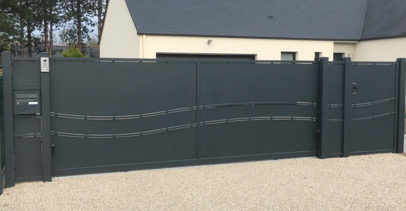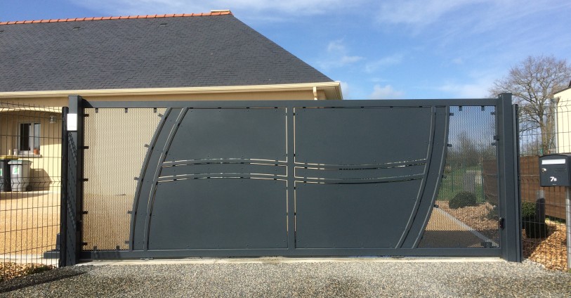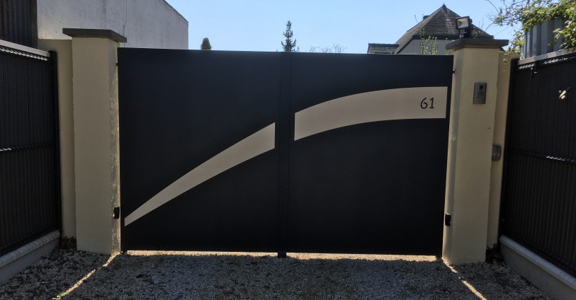 Portail 2 vantaux avec tôle habillage virgule visées sur portail et découpe laser dans la tôle d’habillage : numéro de maison.