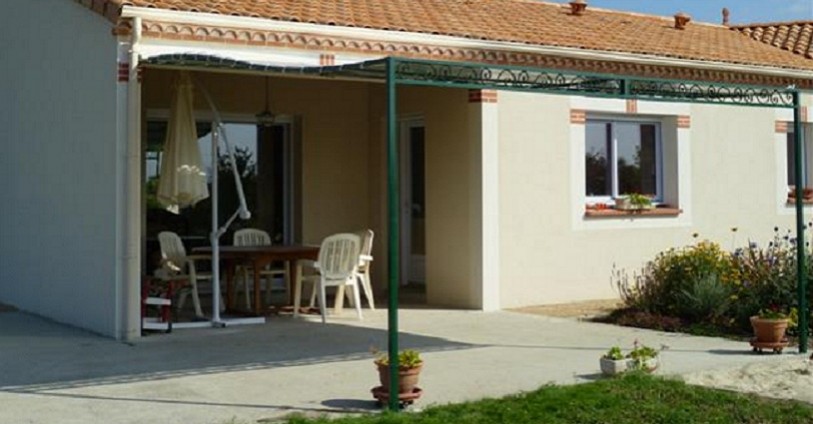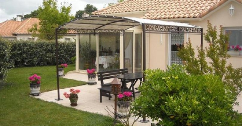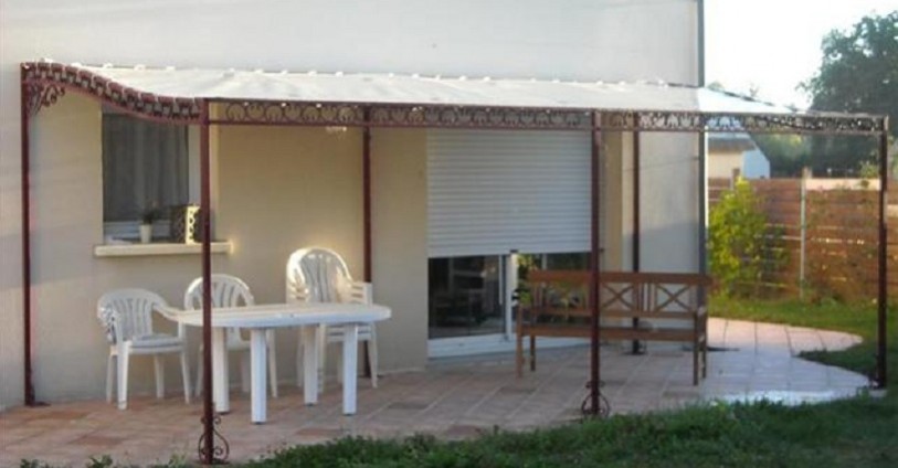 Pergola fixée avec platine au mur, poteaux sur platine en façade, rangée de S en façade. Forme 1/2 CDG.