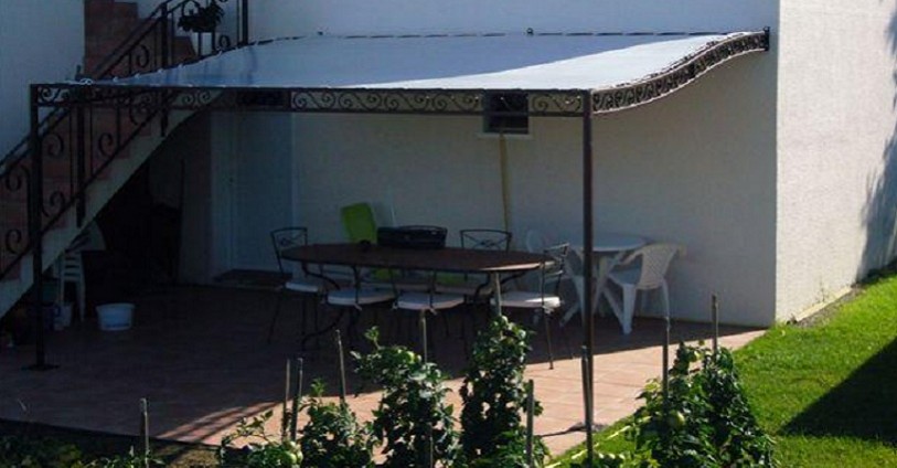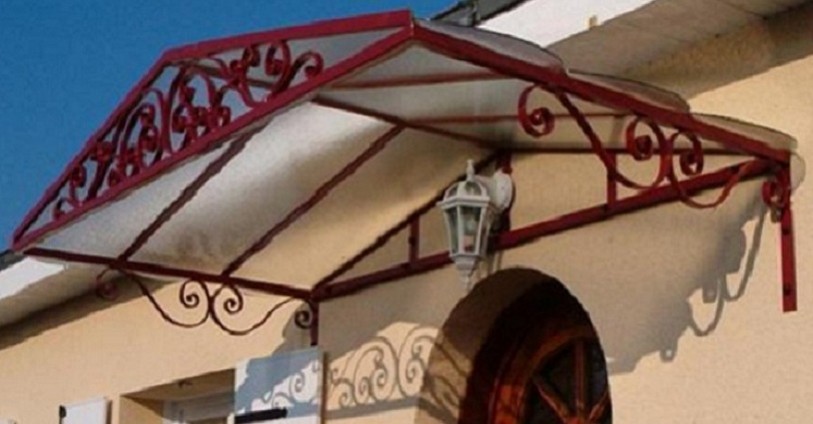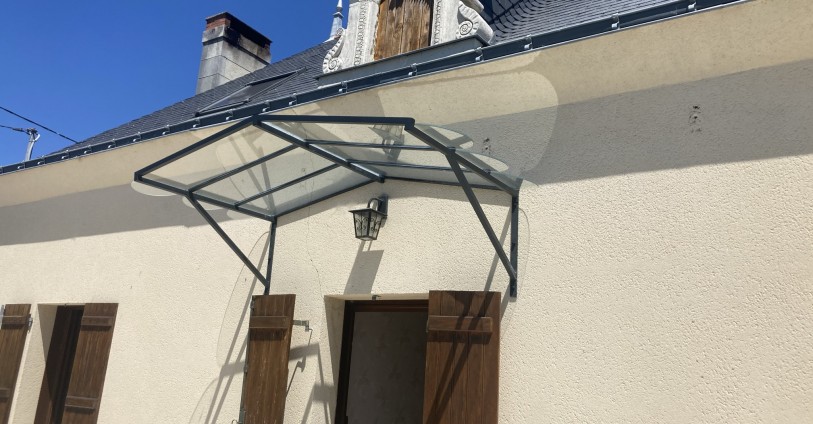 Marquise fixé au mur avec volutes K7502 en façade et double volutes en S sur chaque côtés. Forme 2 pentes. !!! Les verres ont été installés par le client !!!